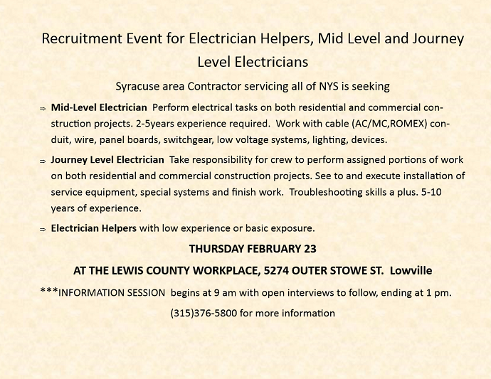 | Recruitment Event Thursday in Lowville for Electrician Helpers, Mid Level and Journey Level Electricians 02/22/17 09:00am |