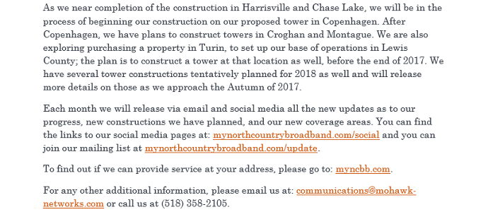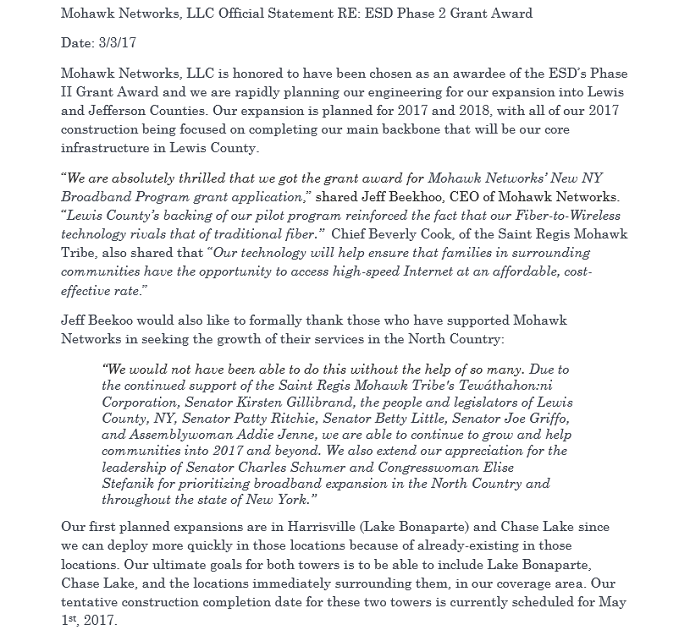 | Mohawk Networks Announces Lewis County Broadband Expansion Plan After Receiving Grant Funding 03/03/17 03:00pm |
