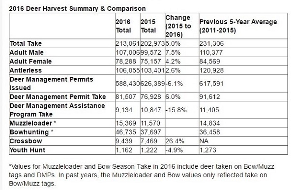 DEC Announces 2016 Deer Harvest Estimates Hunters in New York State harvested an estimated 213,061 deer during the 2016-17 hunting seasons, an estimated five percent increase over 2015-16 levels, Department of Environmental Conservation (DEC) Commissioner Basil Seggos announced today. "Deer hunting in New York is a proud and economically important tradition that is safely enjoyed by hundreds of thousands of residents and visitors each year," Commissioner Seggos said. "Not only is deer hunting important for providing high quality local protein to families, it is an essential conservation tool that helps reduce negative ecological impacts of deer on forests, farms and communities throughout the state." The 2016 deer take included 106,055 antlerless deer and 107,006 antlered bucks. Statewide, this represents a 7.5-percent increase in buck harvest from 2015, reflecting modest population growth following the losses experienced during the harsh winter of 2014-15. Antlerless harvest was similar to 2015 (a 2.6-percent increase), as managers sought increased antlerless harvests in certain parts of the state and reduced harvests in others. Regionally, hunters in the Northern Zone took 24,674 deer, including 16,495 adult bucks. In the Southern Zone, hunters took 188,387 deer, including 90,511 adult bucks. DEC's 2016 Deer Harvest Summary report (PDF 3.75 MB) provides a suite of tables, charts, and maps detailing the statewide deer harvest. Past harvest summaries are available on DEC's website. Last year, DEC kicked off a campaign to encourage hunters to voluntarily pass up shots at young bucks in an effort to grow the population of larger bucks across the state. In areas where hunters had the freedom to choose what type of buck to take, nearly half of the adult bucks taken this past year were 2.5 years or older. Yearling bucks were plentiful, a result of strong survival rates through the 2015-16 winter, yet many hunters voluntarily chose restraint. "It's clear that DEC's public education programs are yielding success, as more hunters are heeding our advice to 'let young bucks go to watch them grow' providing all hunters the opportunity to see and take larger, more mature bucks," said Commissioner Seggos. DEC also confirmed that bucks of all ages across the state were in good condition, with larger antlers, more mass, and fewer spike-antlered bucks. Notable Numbers