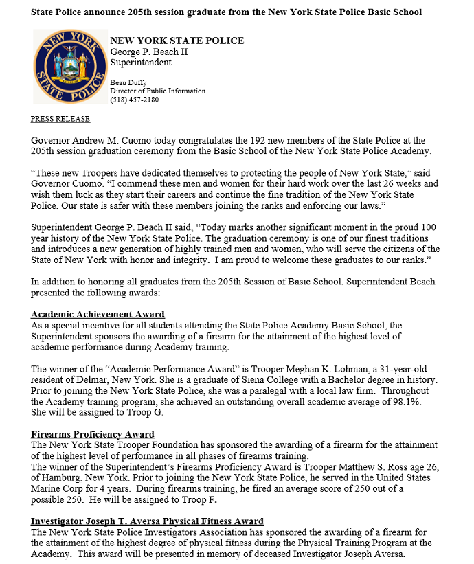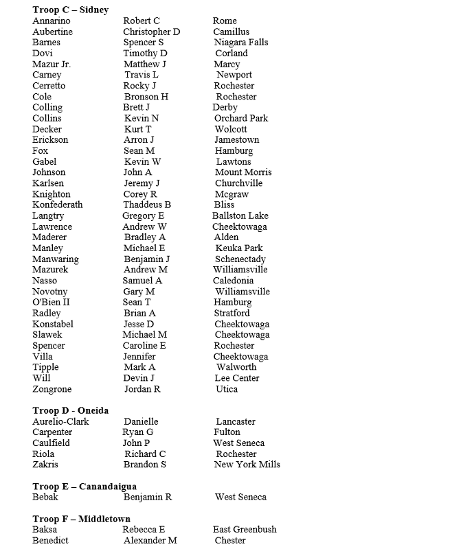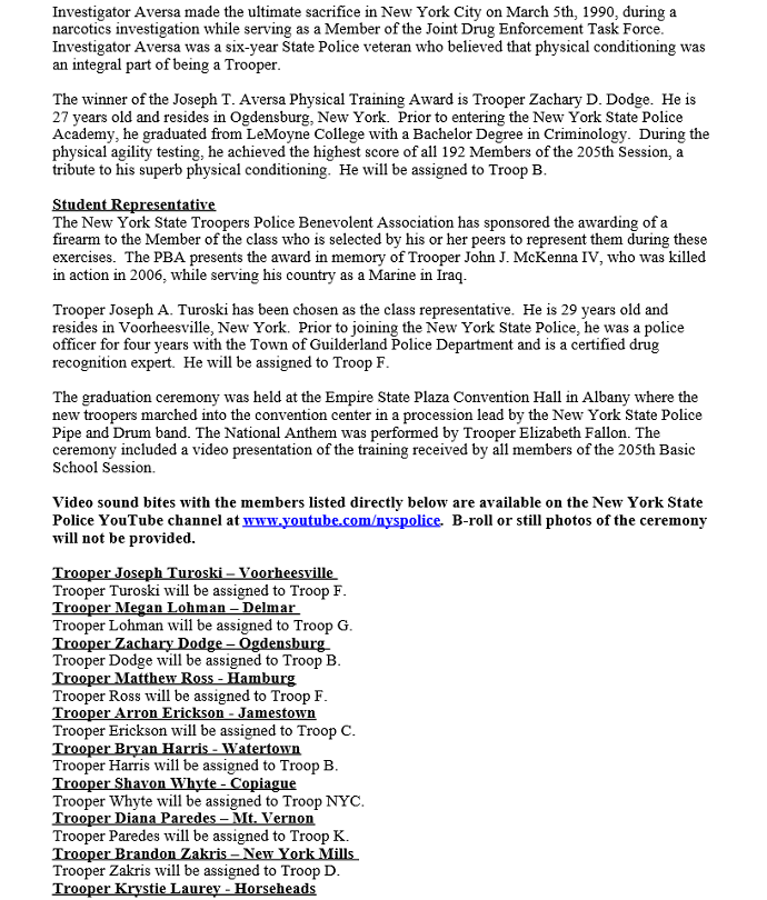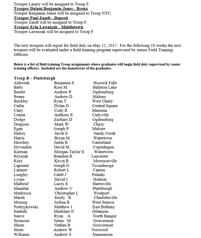 | Three From Lewis County Among 192 Graduates of 205th Session of NYSP Basic School 05/10/17 03:00pm |