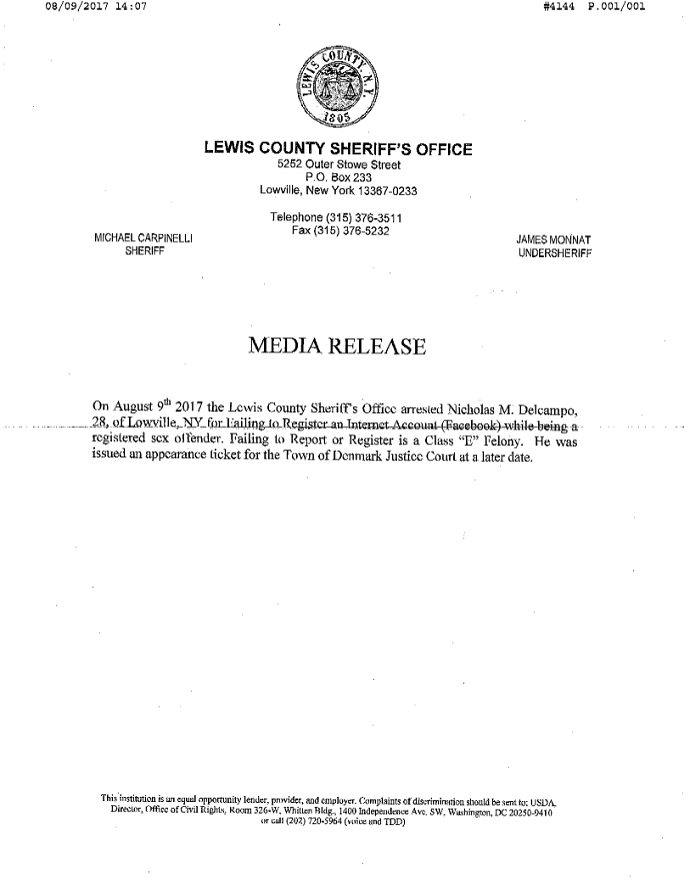 | LCSO: Sex Offender Arrested for Failing to Register Facebook Account 08/09/17 02:30pm |