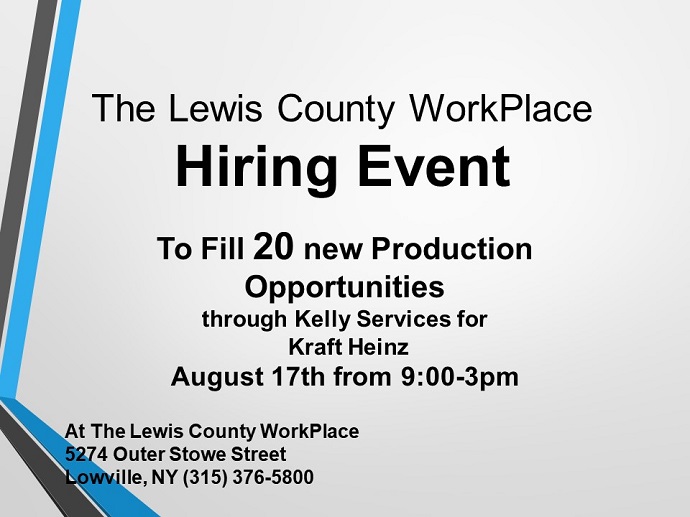 | Lewis County WorkPlace Hosting Hiring Event August 17 to Fill 20 New Production Positions at Kraft Heinz 08/11/17 02:30pm |