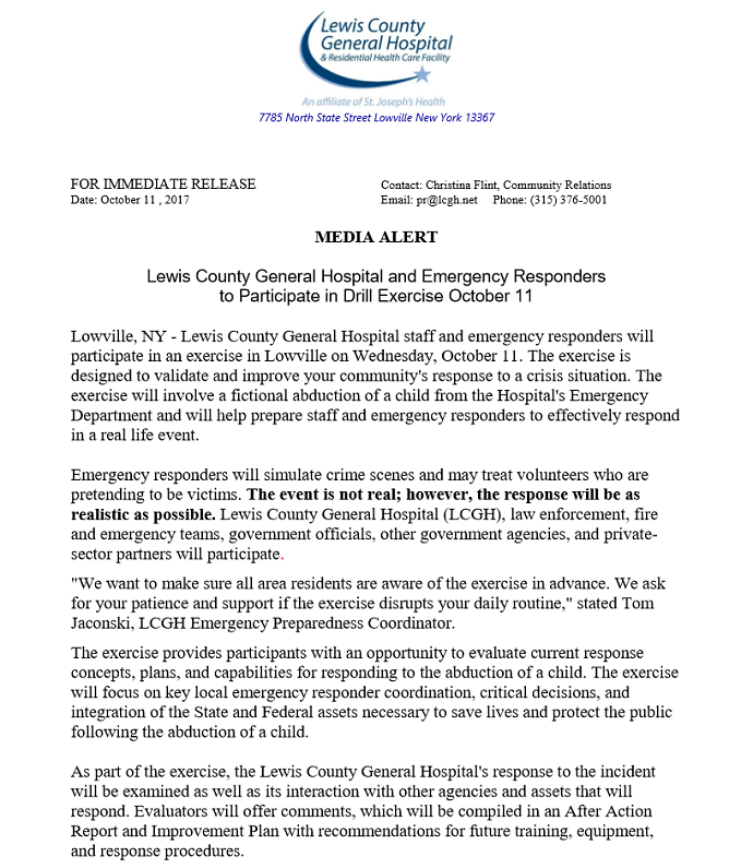 | LCGH and Emergency Responders to Participate in Live Drill Exercise This Evening 10/11/17 06:15pm |