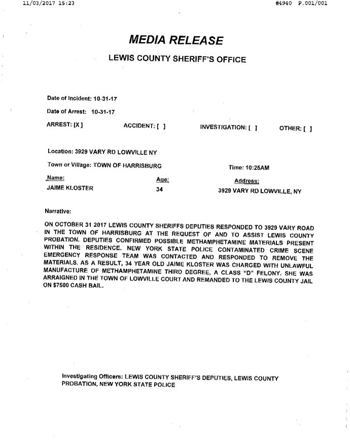 | LCSO: Lowville Woman Jailed on Meth Manufacturing Charge 11/03/17 03:30pm |