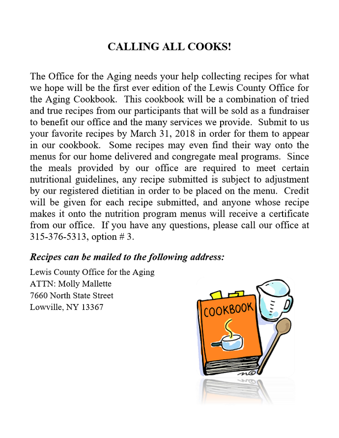 | County Office for the Aging Seeking Recipes for Cookbook Fundraiser 02/08/18 10:15am |