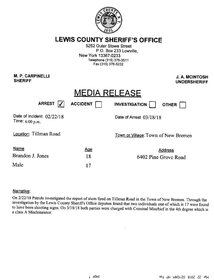 | LCSO: Two Teens Charged After Allegedly Shooting at Road Signs in New Bremen in February 03/21/18 10:15pm |