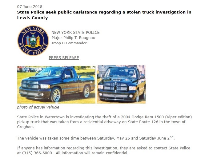 | State Police Seek Public Assistance Regarding Stolen Truck in Croghan 06/07/18 04:45pm |