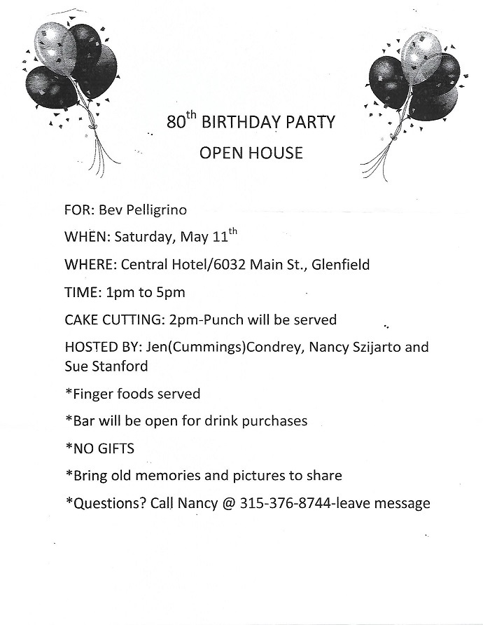80th Birthday Party Open House for Bev Pelligrino May 11 in Glenfield