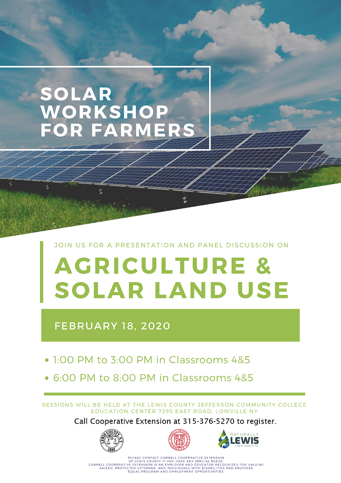 | Agriculture and Solar Land Use Workshop Scheduled for February 18 in Lowville January 30, 2020 08:30 a.m. |