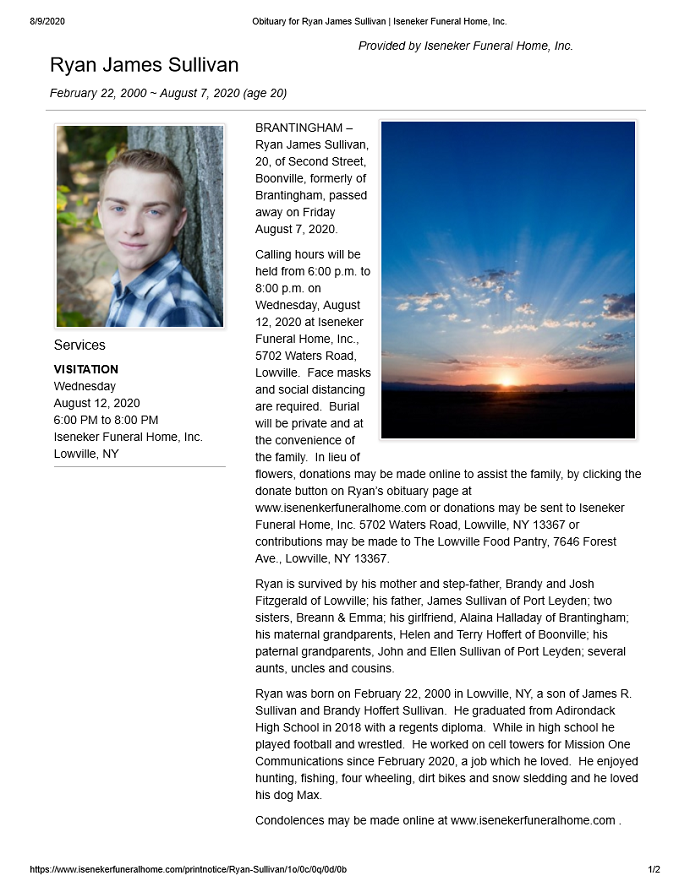 Obituary: Ryan J. Sullivan, 20- Brantingham
