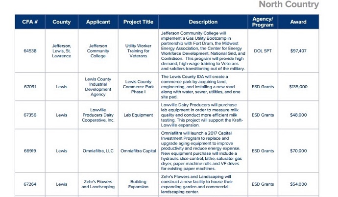 Regional Economic Development Council awards on Thursday, divided among the State's ten regions. The North Country region, which includes Clinton, Essex, Franklin, Hamilton, Jefferson, Lewis and St. Lawrence counties, received a total of $61.4 million in funding across 77 projects. Lewis County received a total of $307,000, covering four projects. The Lewis County details are included below, and you can see a list of all of the awards handed out by region here. |