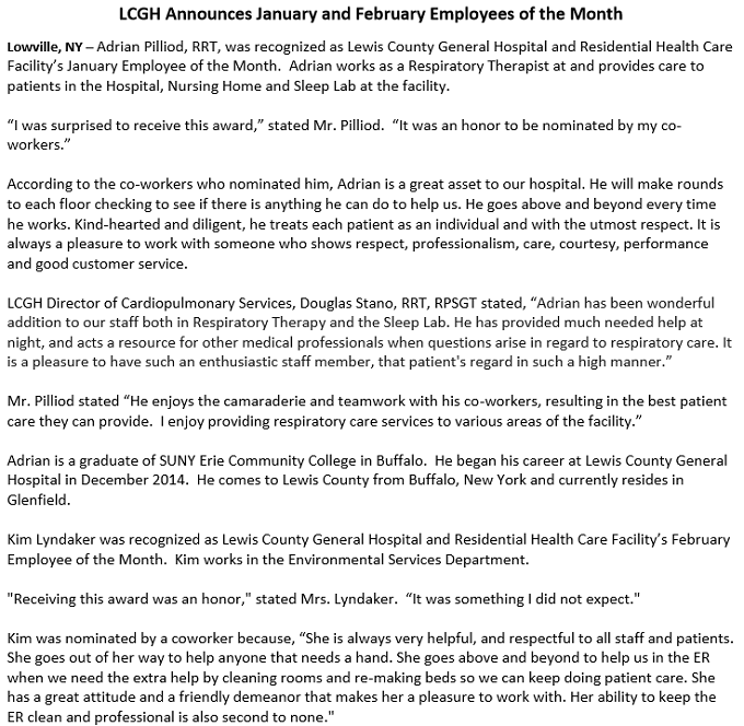 | LCGH Announces January and February Employees of the Month 04/08/16 03:30pm |