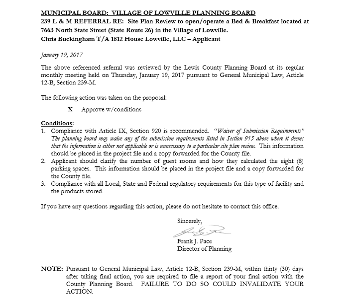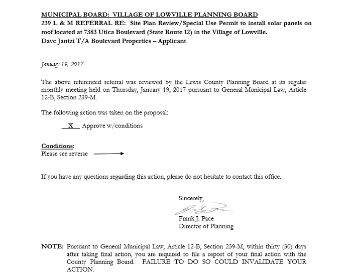 meeting this afternoon in Lowville, giving approval, with conditions, to a pair of projects in the Village of Lowville. Both recommendations are included below- a site plan review for a proposed Bed & Breakfast on N. State St. and a special use permit application for the installation of solar panels on a Utica Blvd. building. |