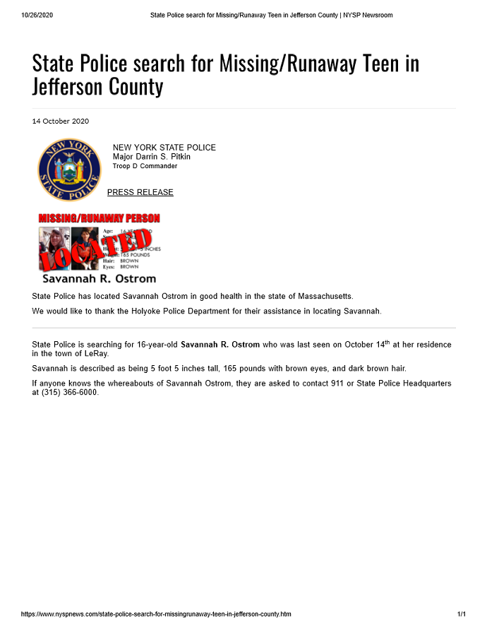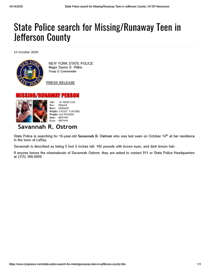 | State Police Search for Missing/Runaway Teen in Jefferson County October 14, 2020 05:00 p.m. Updated October 26, 2020 04:00 p.m. |
