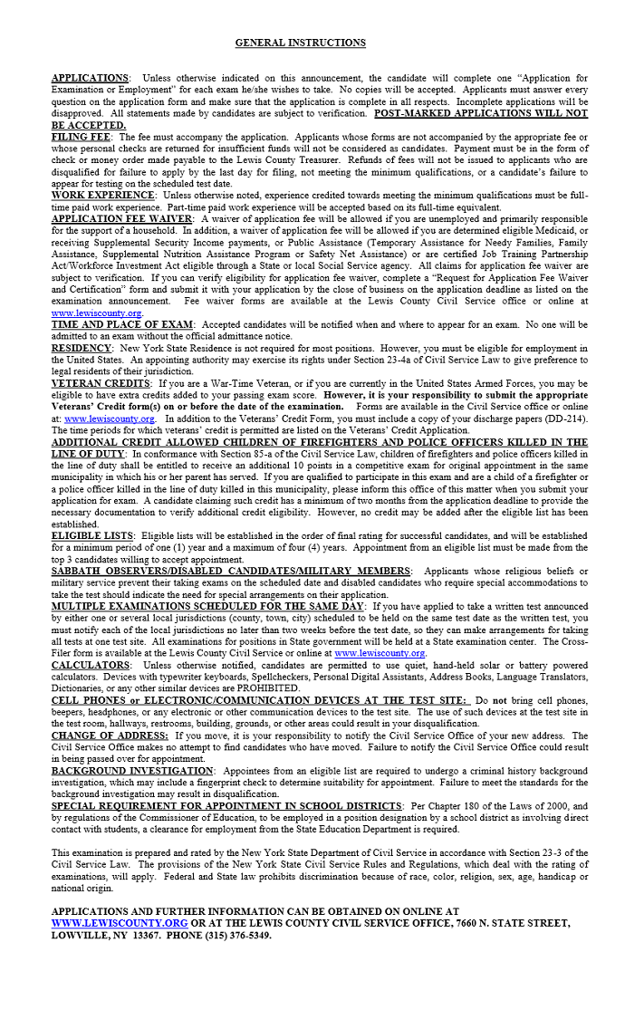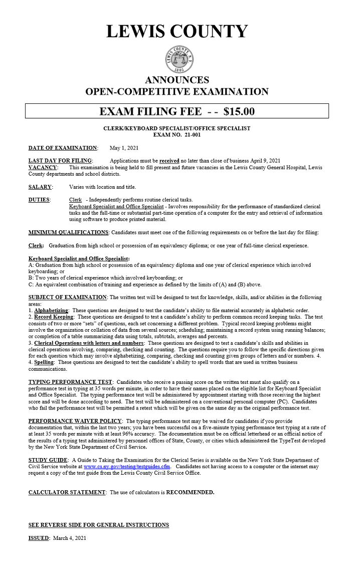 | Lewis County Civil Service Exam Announcement: Clerk/Keyboard Specialist/Office Assistant March 04, 2021 12:15 p.m. |