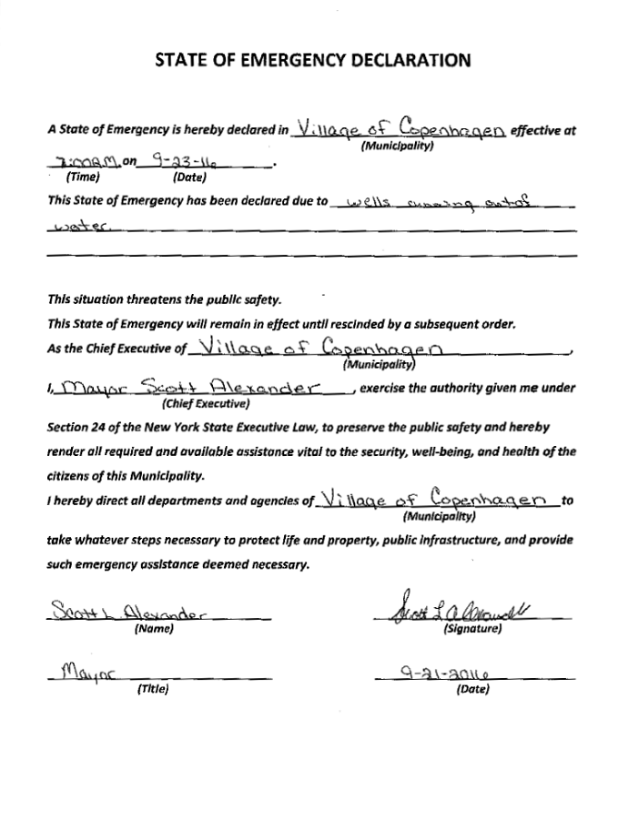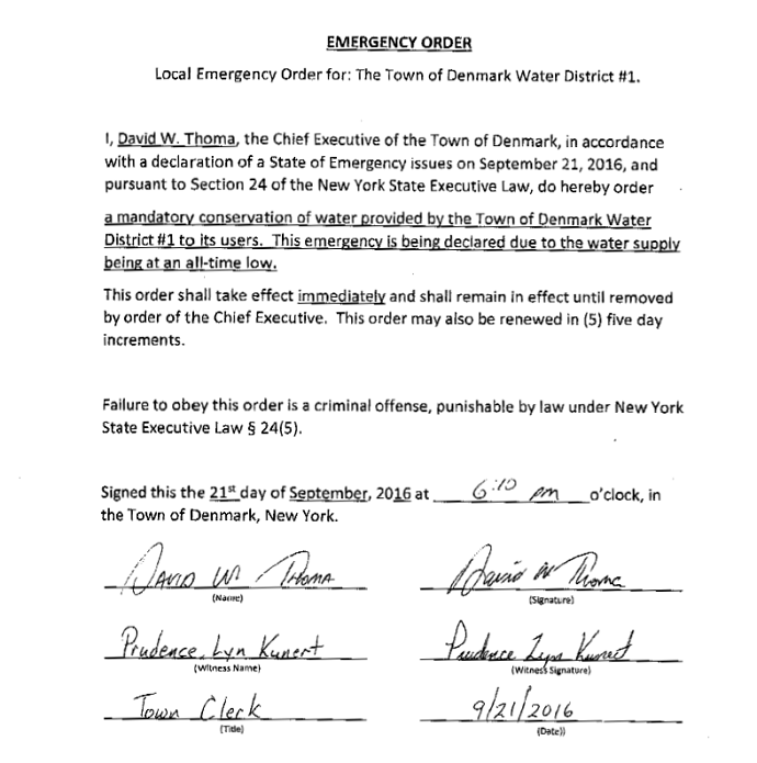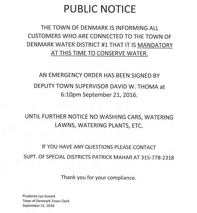 announcement to all users of the Village of Copenhagen Water supply. This includes the users of the Town of Denmark Water DIstrict 1. It is mandatory that all residents conserve water until further notice. This is due to the low water levels in the wells. |