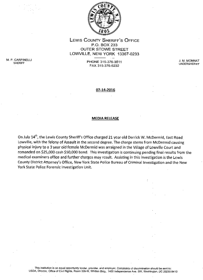 | Deputies Charge Lowville Man With Assaulting 3-Year-Old 07/14/16 08:50pm |