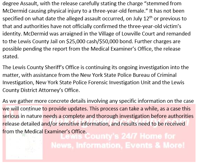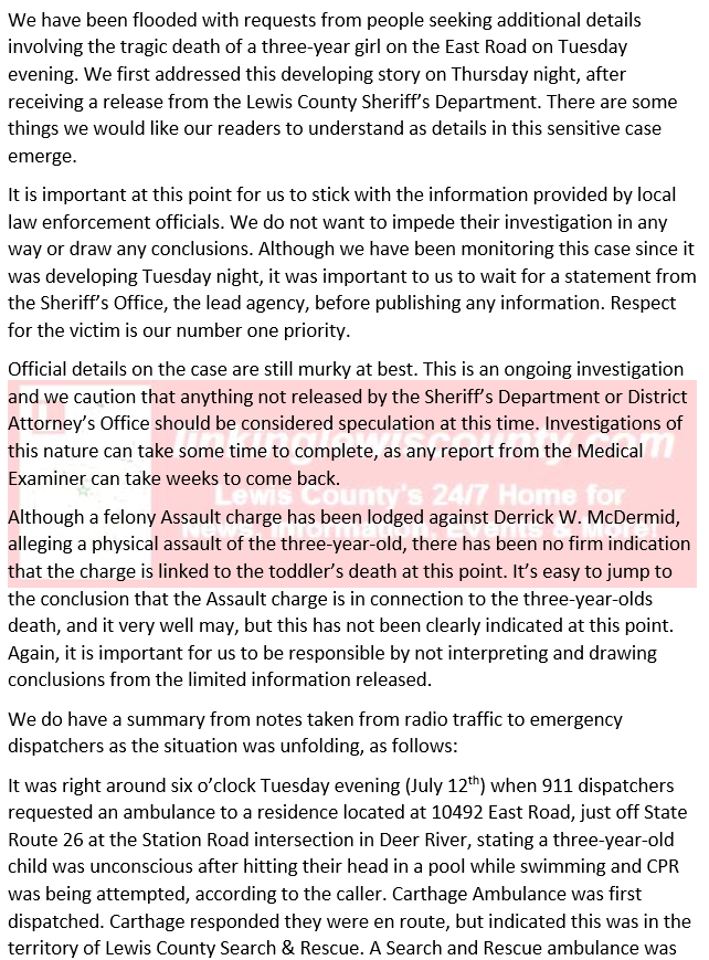 | Investigation Into Tuesday Evening Tragedy on East Road Ongoing By: Nick Altmire (nick@linkinglewiscounty.com) 07/17/16 12:30pm |