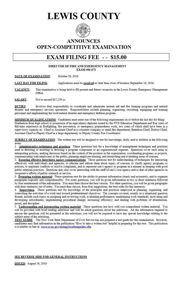 | Civil Service Exam Announcement: Director of Fire and Emergency Management 08/29/16 10:00am |
