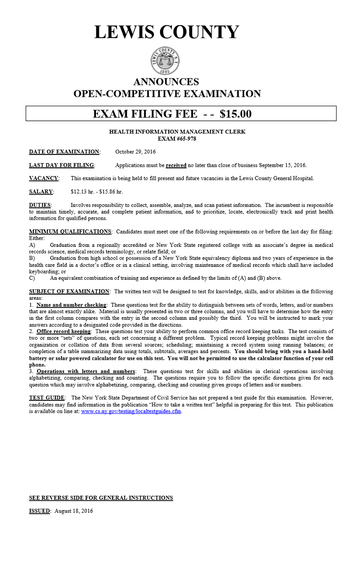 | Civil Service Exam Announcement: Health Information Management Clerk 08/29/16 10:00am |