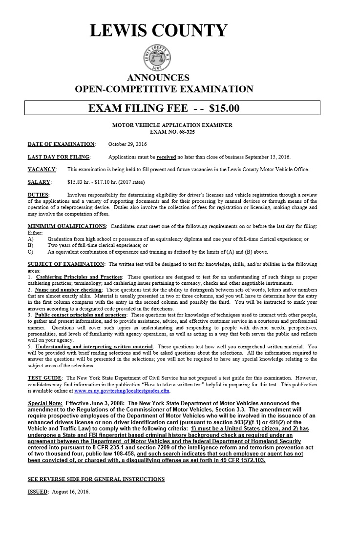 | Civil Service Exam Announcement: Motor Vehicle Application Examiner 08/29/16 10:00am |
